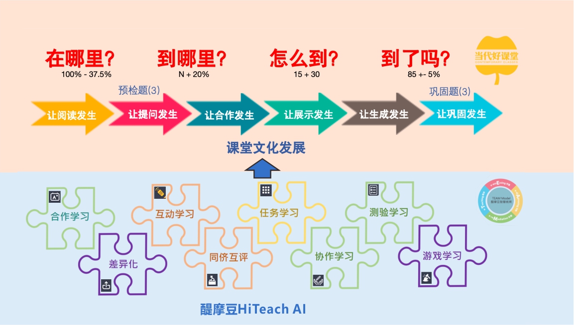 打造一堂好課的成功密碼:文化+技術(shù)。其中,文化需緊扣四大核心追問(wèn)——“在哪里?”“到哪里?”“怎么到?”“到了嗎?”,依托六個(gè)發(fā)生:以“讓閱讀發(fā)生”激活思維,以“讓提問(wèn)發(fā)生”深化探究,以“讓合作發(fā)生”促進(jìn)社會(huì)性成長(zhǎng),以“讓展示發(fā)生”錘煉表達(dá)力,以“讓生成發(fā)生”推動(dòng)創(chuàng)新遷移,以“讓鞏固發(fā)生”實(shí)現(xiàn)結(jié)構(gòu)化沉淀。最后,利用HiTeach七大方法策略(包括測(cè)驗(yàn)?zāi)K、互動(dòng)模塊、任務(wù)模塊、合作學(xué)習(xí)模塊、協(xié)作模塊、同儕互評(píng)和差異化等功能)實(shí)現(xiàn)技術(shù)賦能,確保教學(xué)過(guò)程的高效推進(jìn),讓學(xué)習(xí)真實(shí)發(fā)生,助力打造一堂高質(zhì)量的好課。